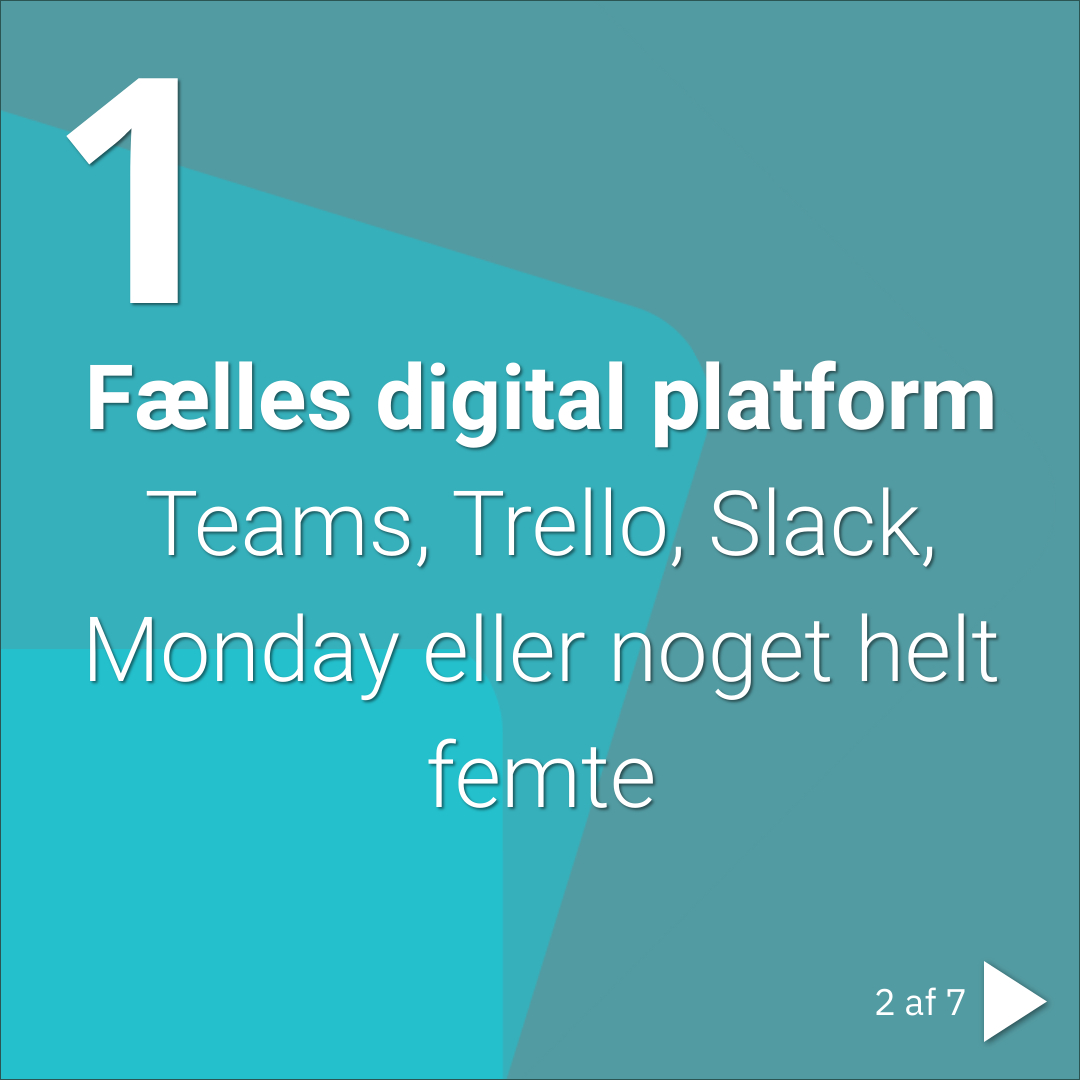 - Brug en fælles digital platform som f.eks. Teams, Trello, Slack, Monday eller noget helt femte til at synliggøre, hvem der gør hvad lige nu, og hvordan fremdriften er.