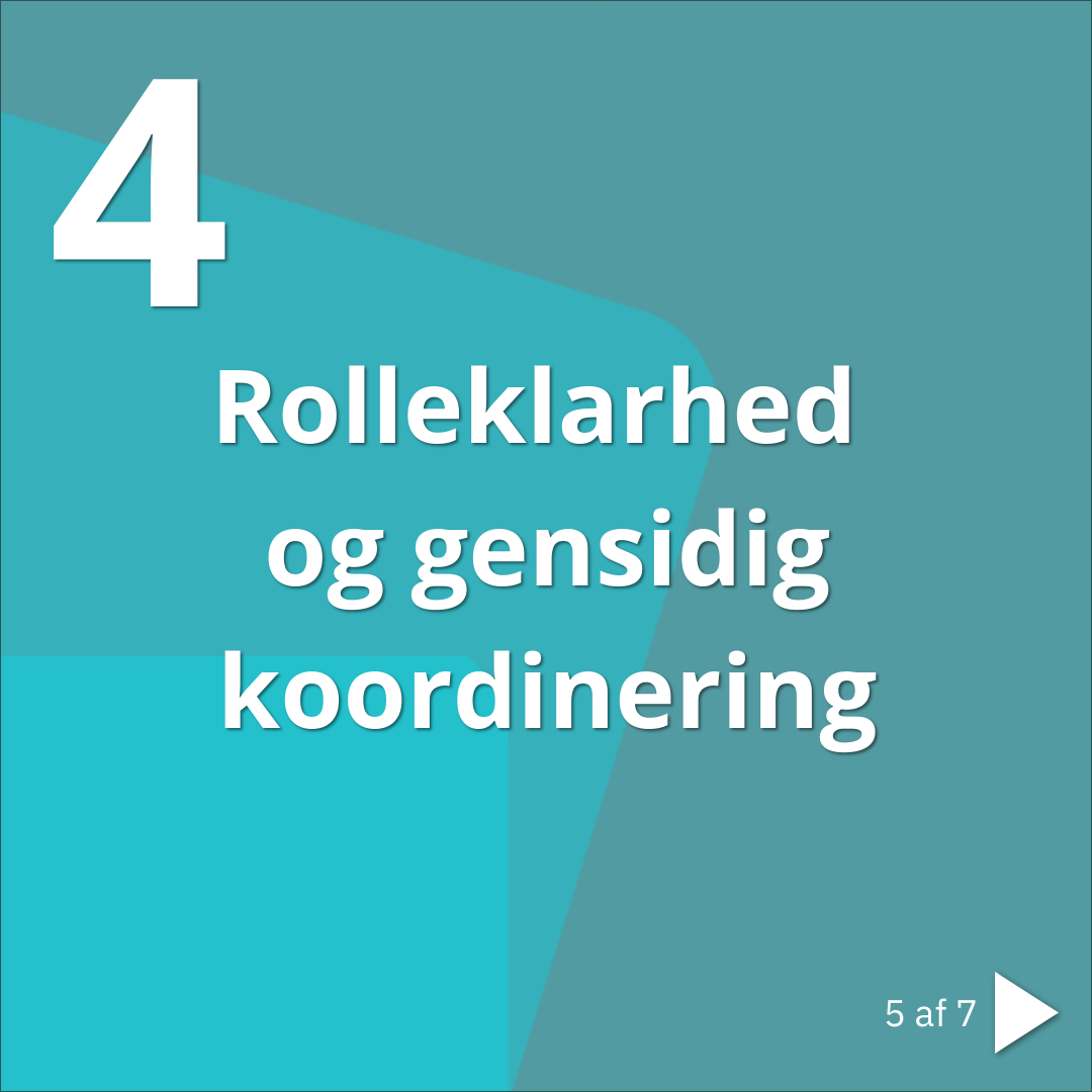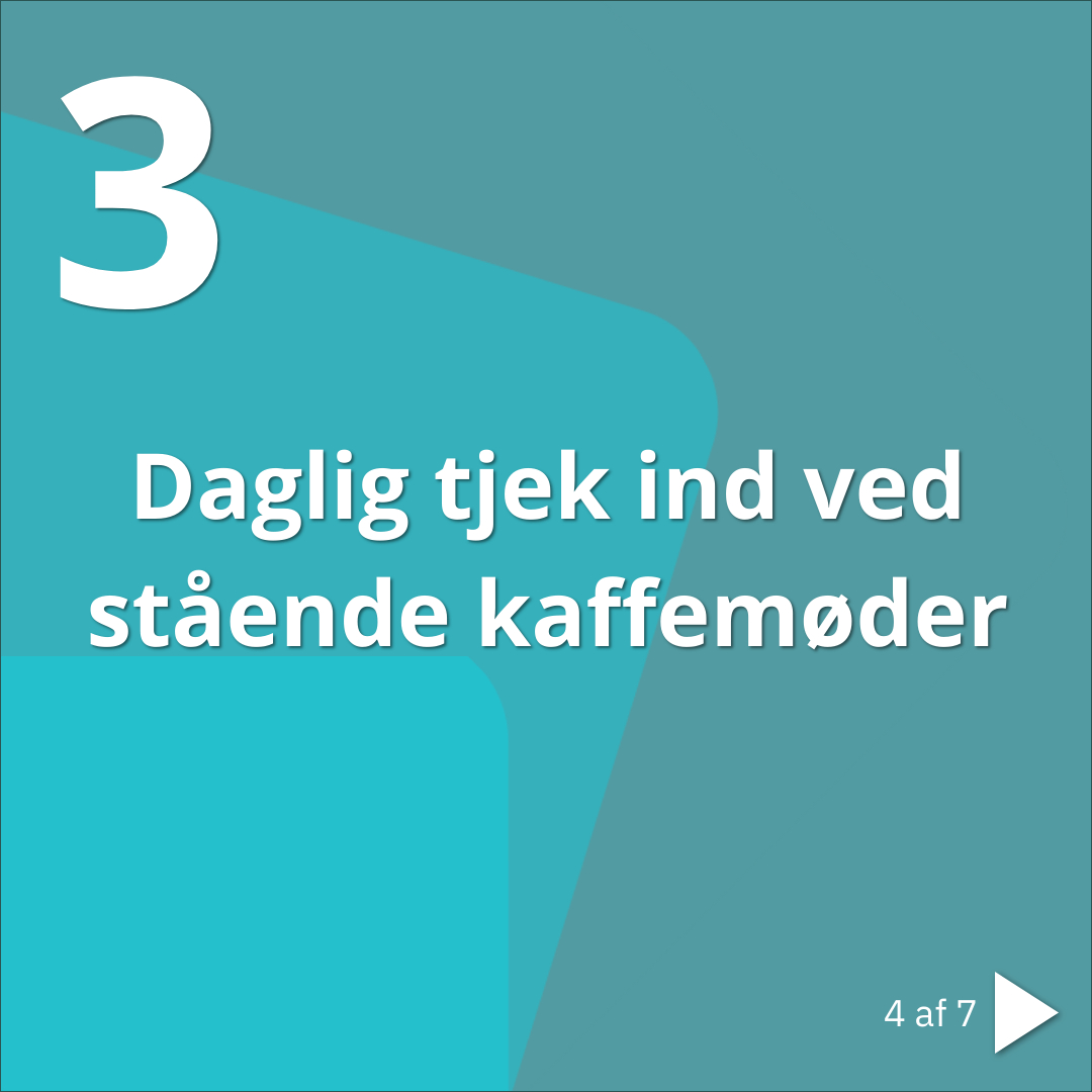 - Hold dagligt morgen-tjek-ind f.eks. ved tavlemøder eller som stående kaffemøder. Viser der sig at opstå problemer her, så håndter dem mellem de involverede parter. Gør jer umage med rolleklarhed, så ting kan løses mellem de to eller tre, der sidder med de konkrete løsninger.